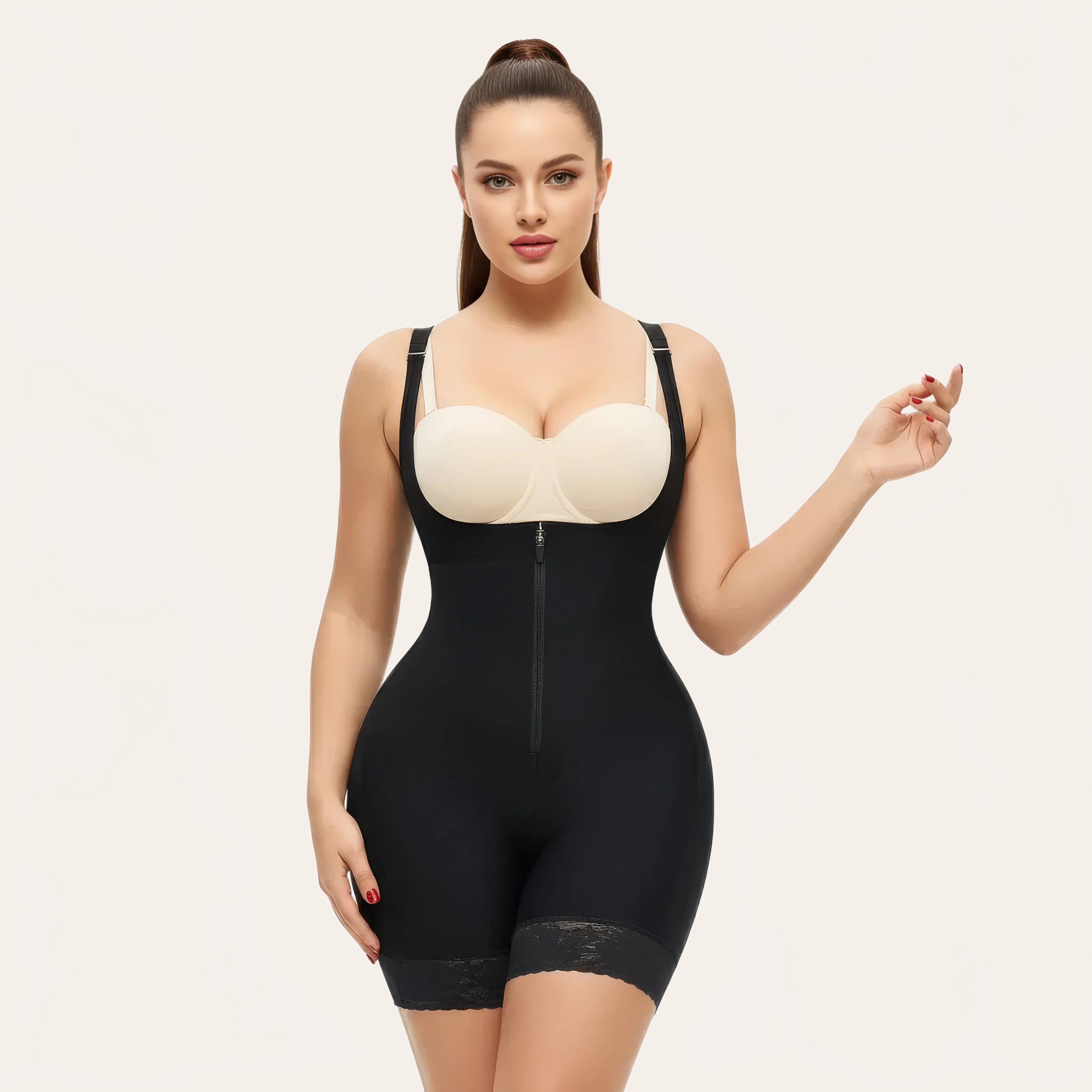 Ein figurformender Overall der neuen Generation, entworfen von FEMORA, um eine hohe Kompression zu bieten und gleichzeitig den Komfort im Alltag zu wahren. Seine 360° formgebende Struktur definiert die Silhouette sofort neu: verfeinerte Taille, geglätteter Bauch und natürliche Hüftkontur.