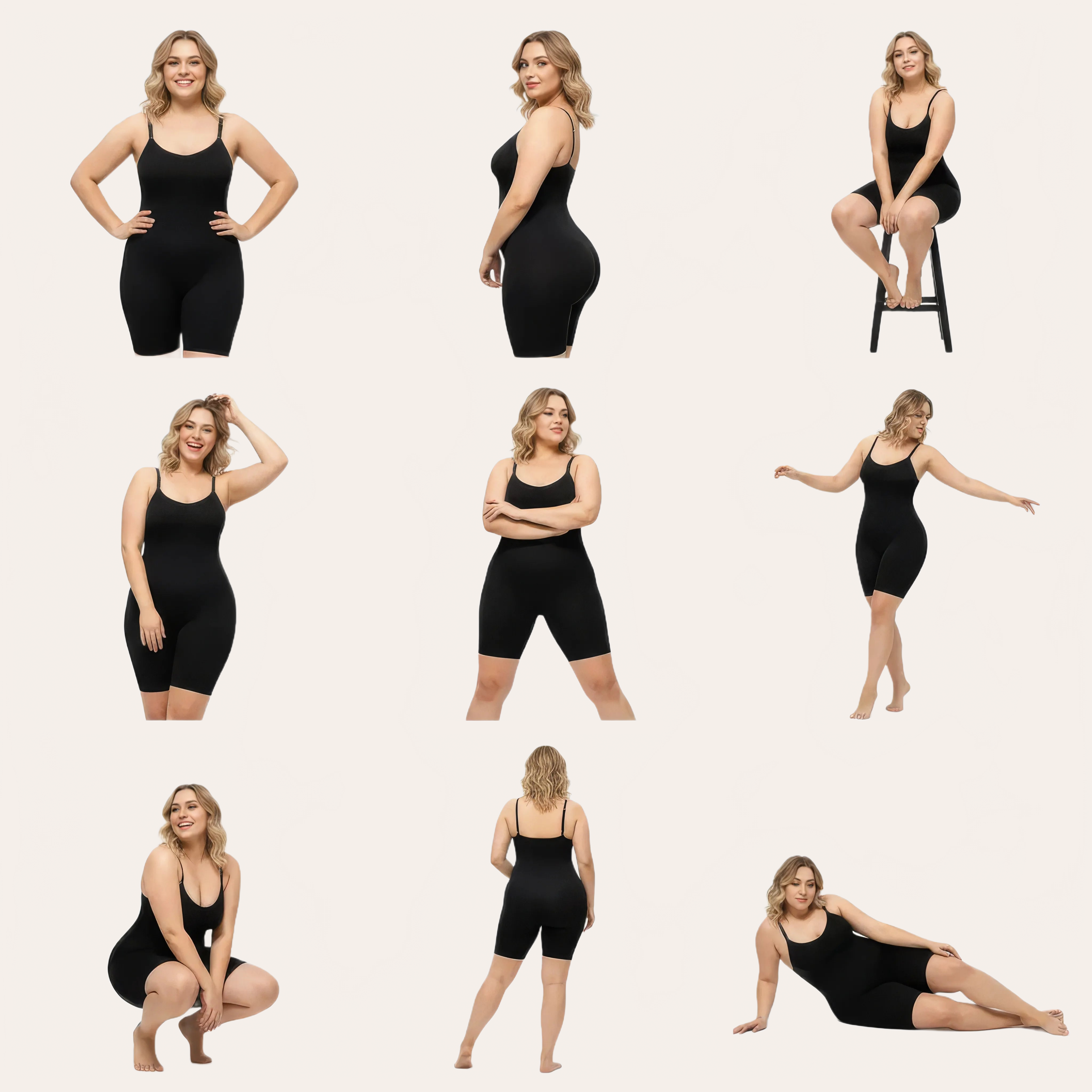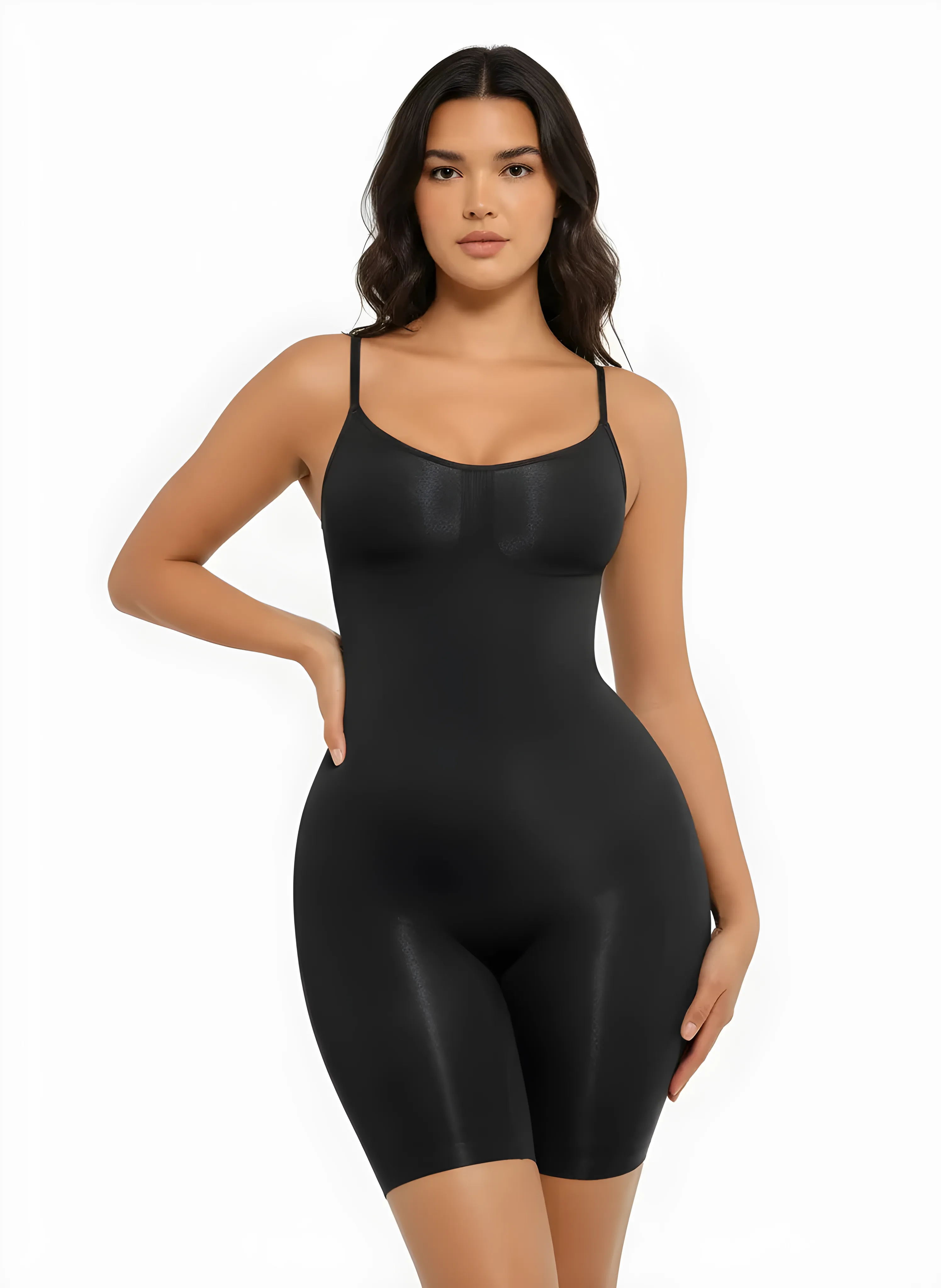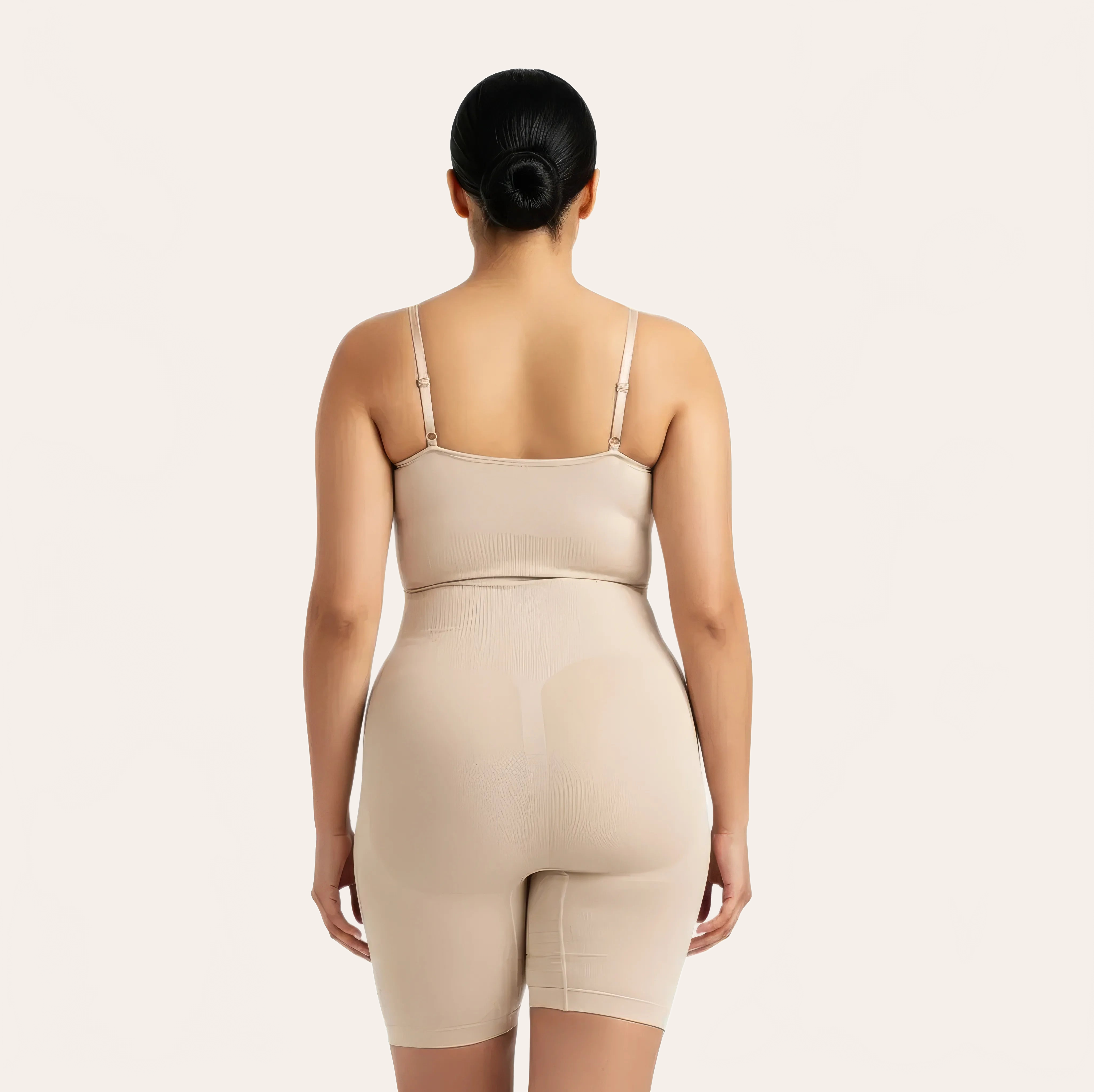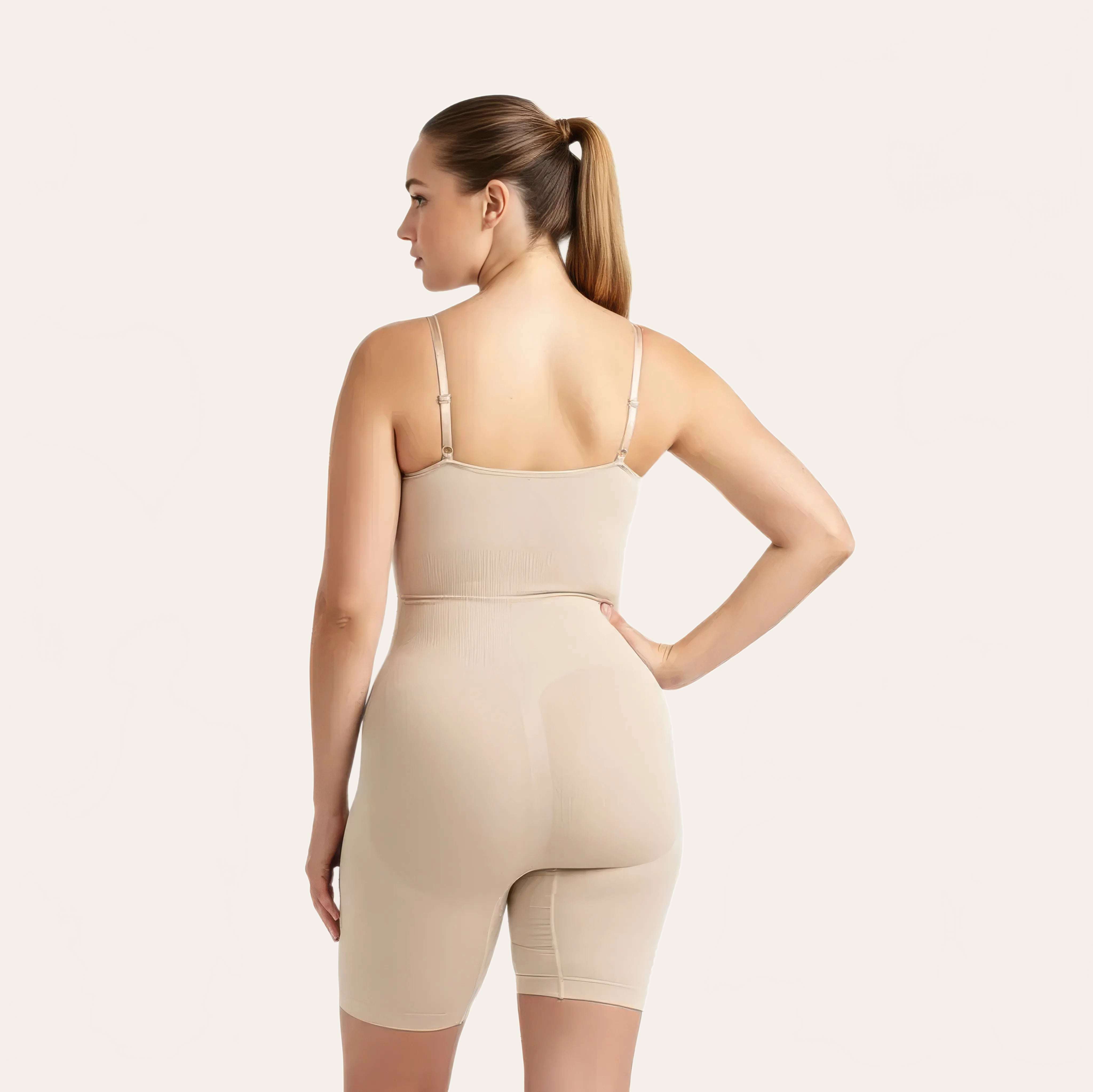 A full sculpting bodysuit designed to enhance the silhouette with elegance, while offering support natural bust support. Its soft, ultra-stretch technical knit hugs the body like a second skin, smooths the waist, slims the tummy, and subtly shapes the hips and thighs.