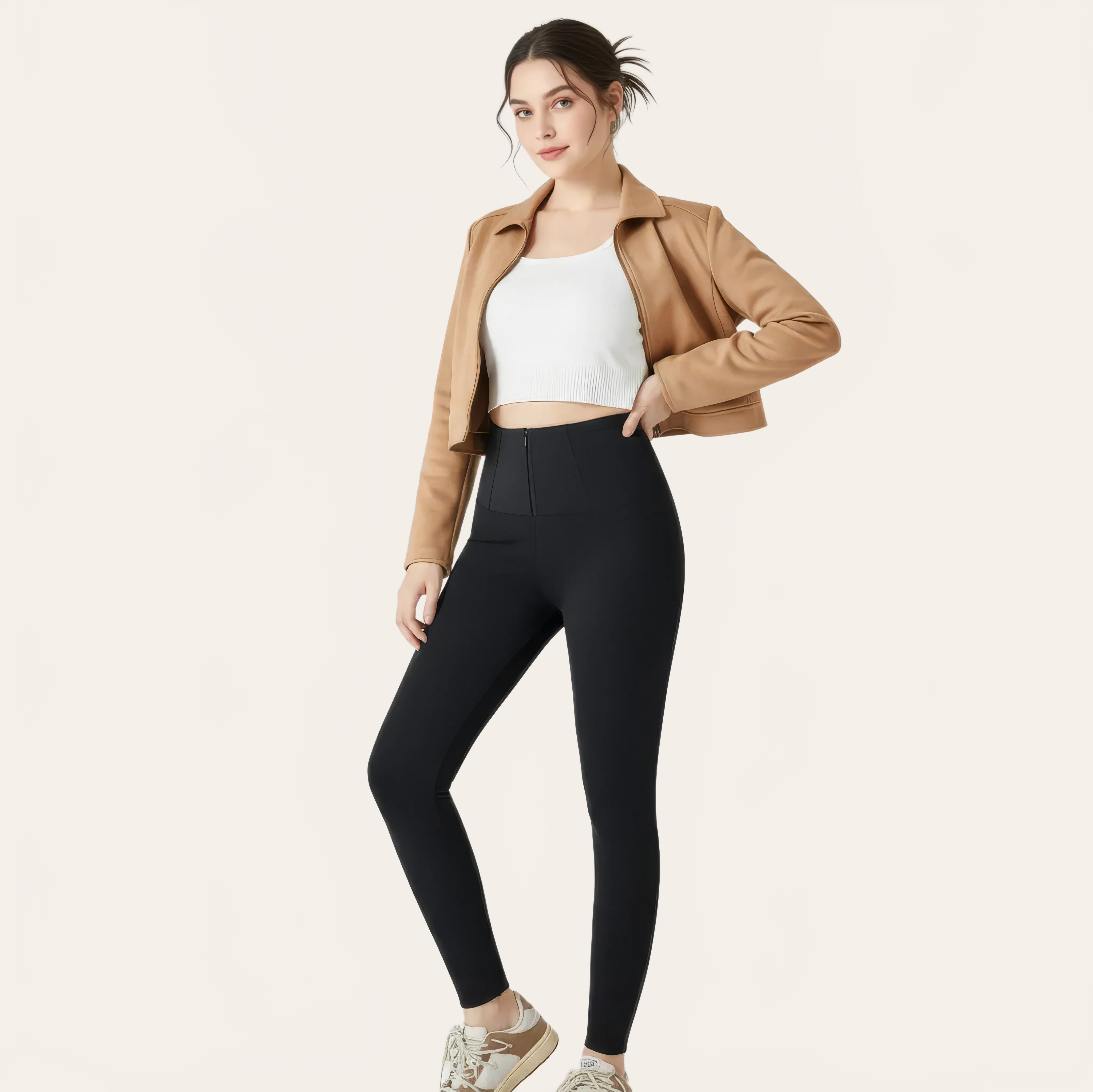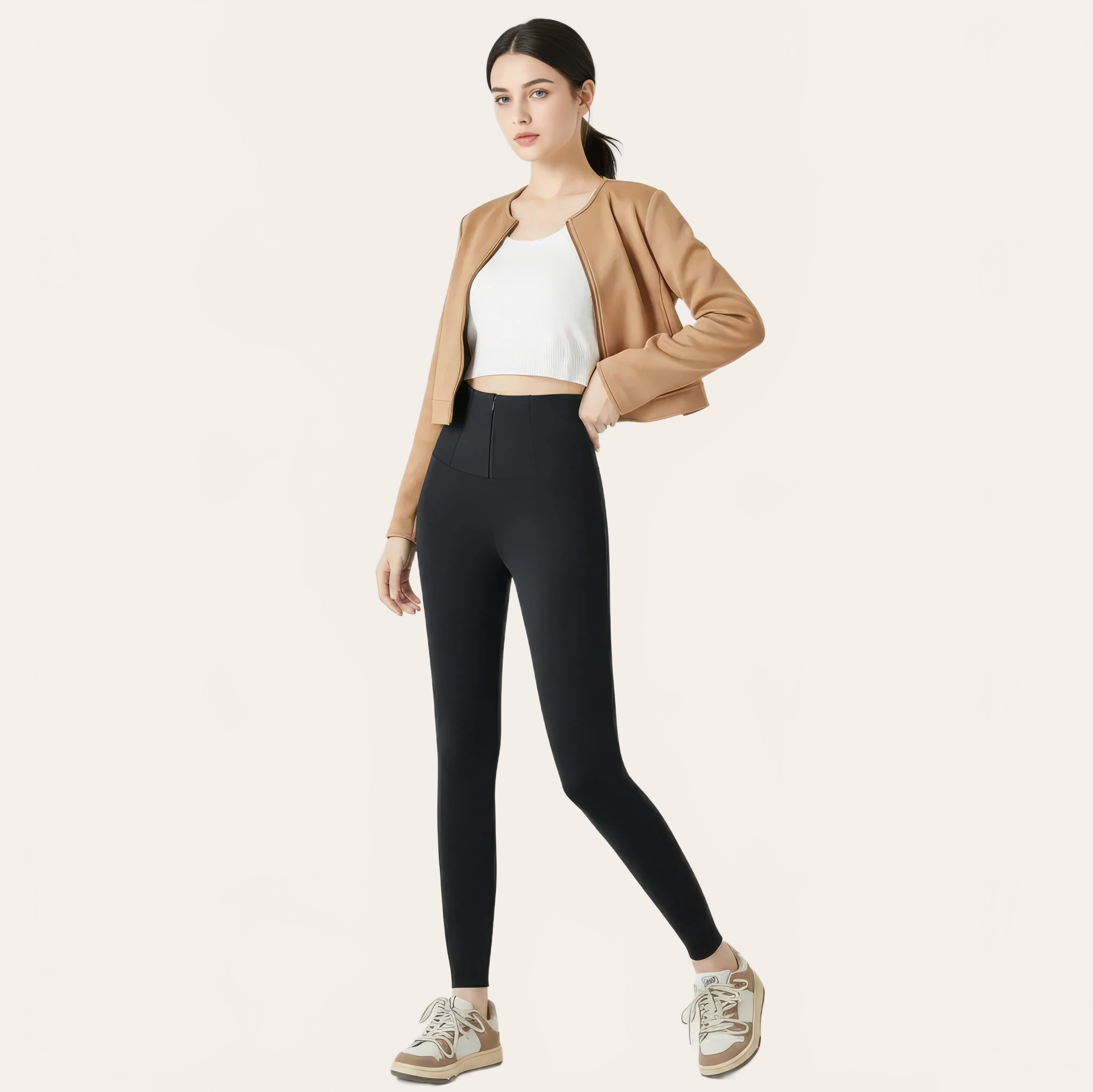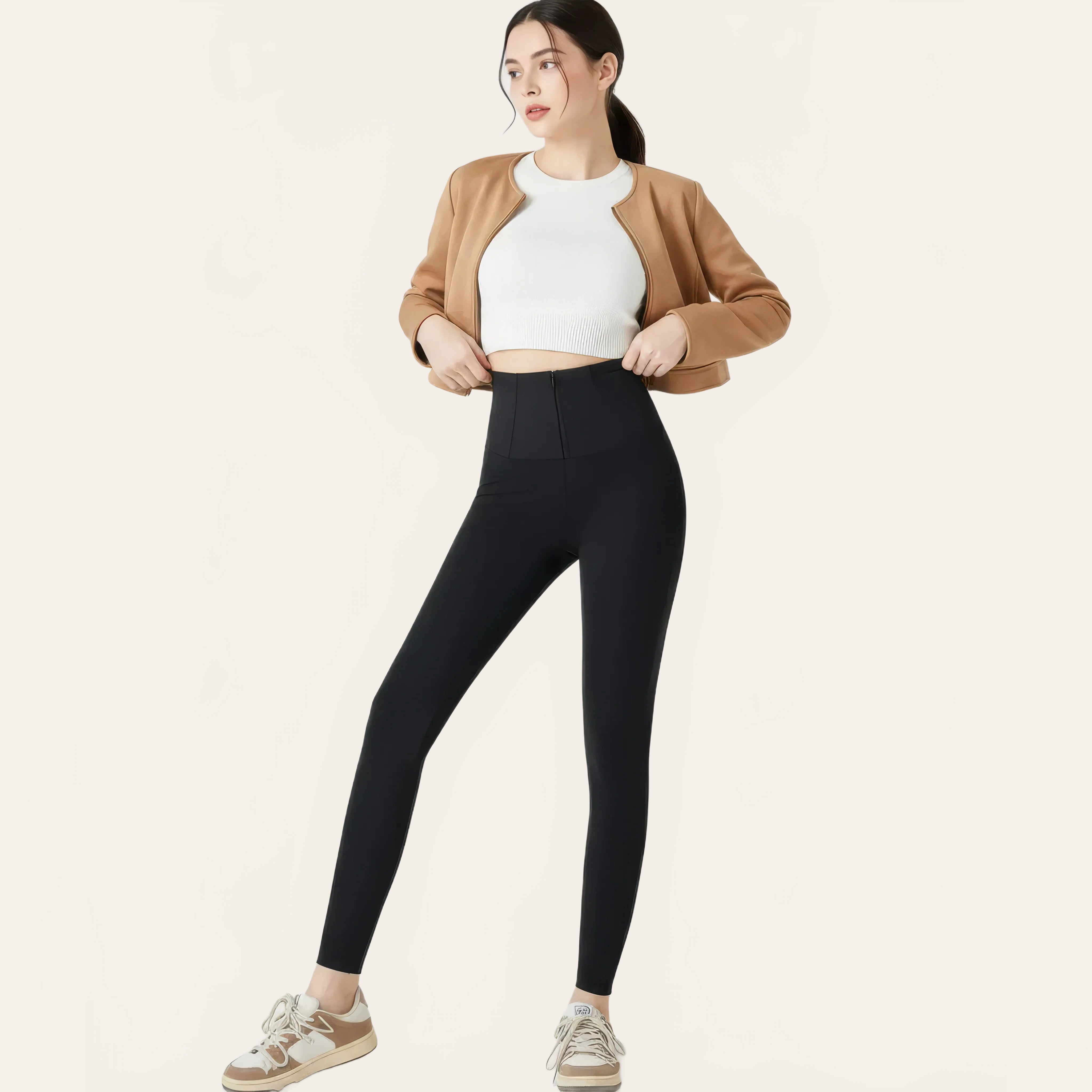 A high-waisted pant designed to smooth the abdominal area and slim the silhouette with elegance. Its fitted cut naturally structures the body while visually elongating the legs.