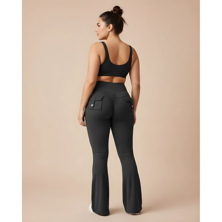 Un pantalón de fitness de cintura alta que combina sujeción estructurada, funcionalidad y elegancia moderna. Su corte ajustado en las caderas realza naturalmente las curvas, mientras que la pierna ligeramente acampanada aporta una silueta estilizada y equilibrada.
