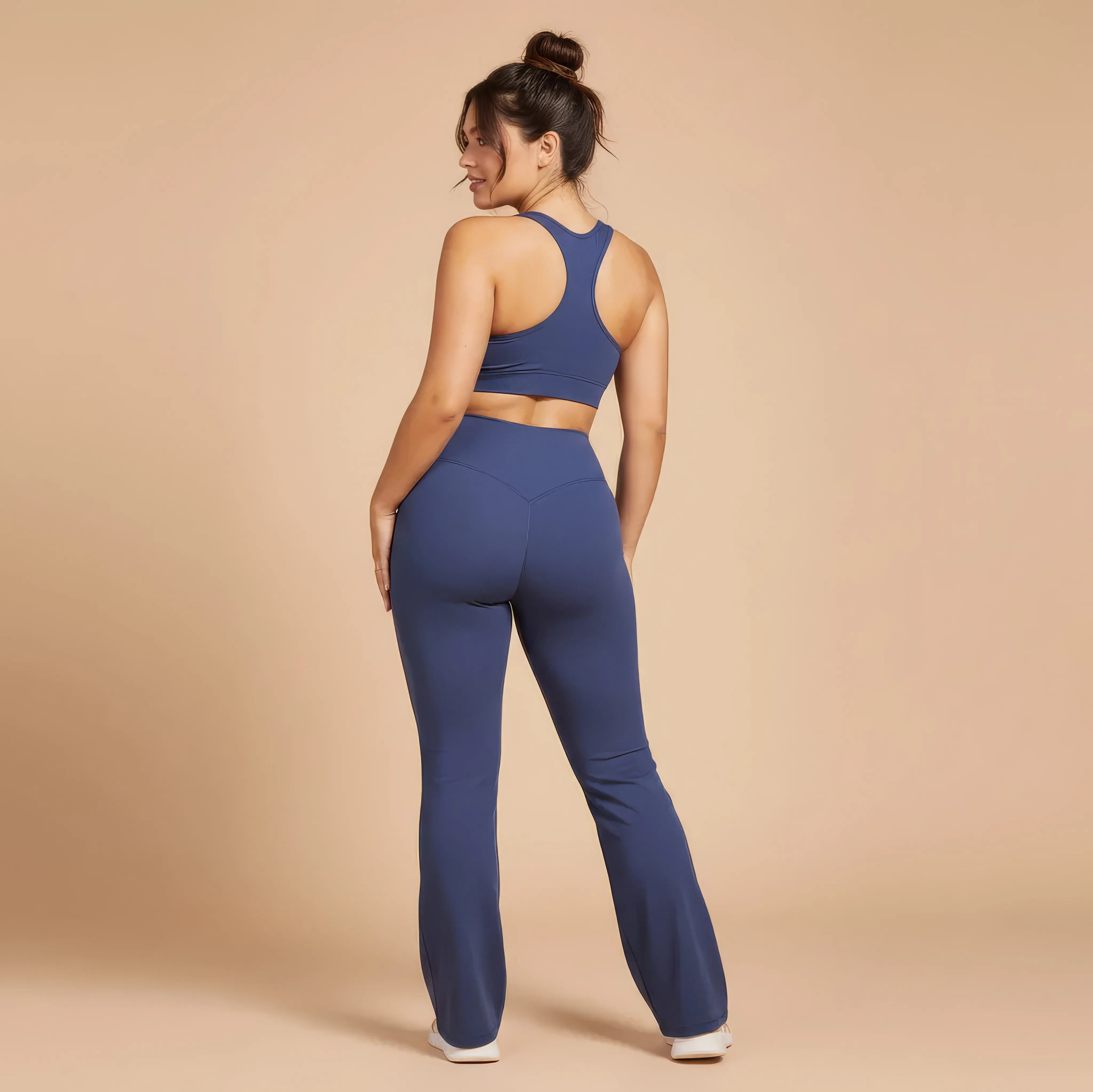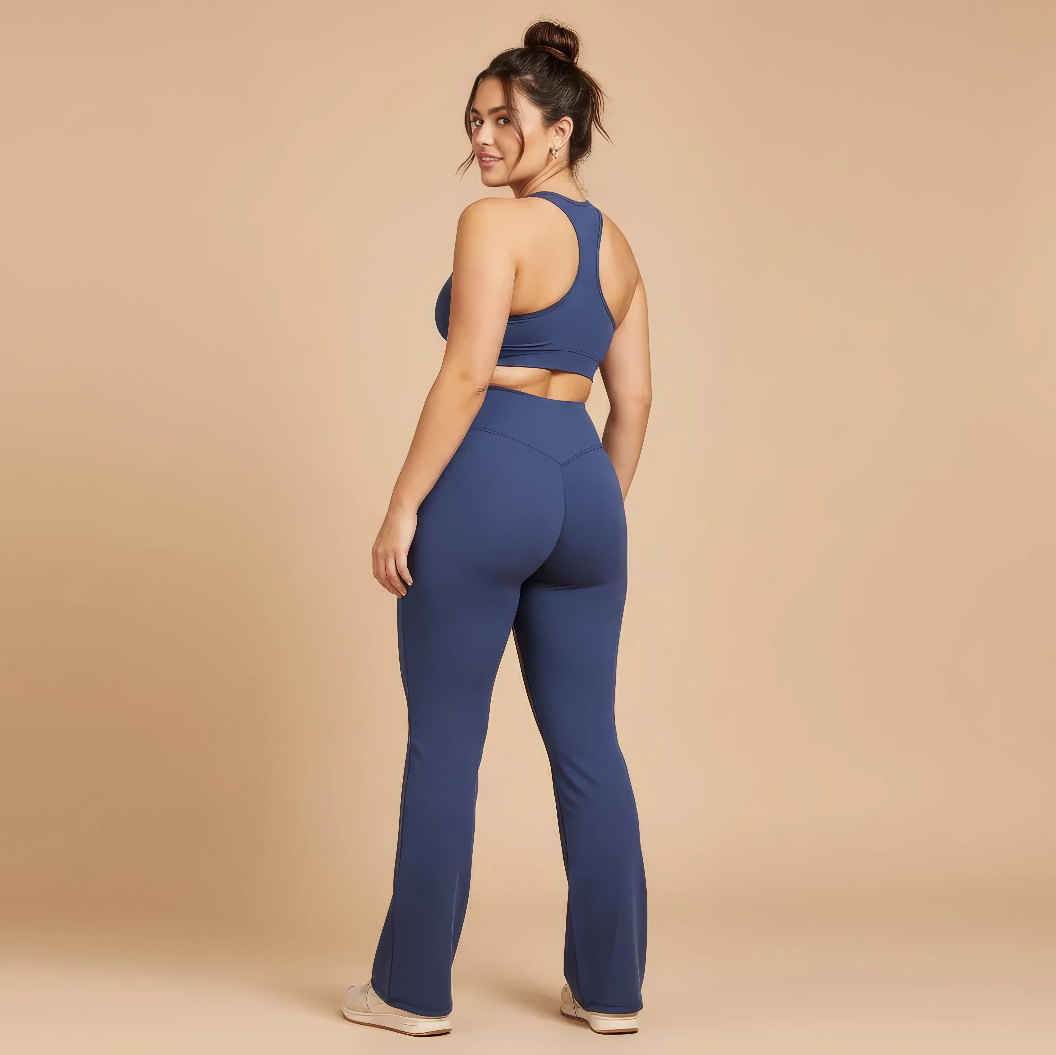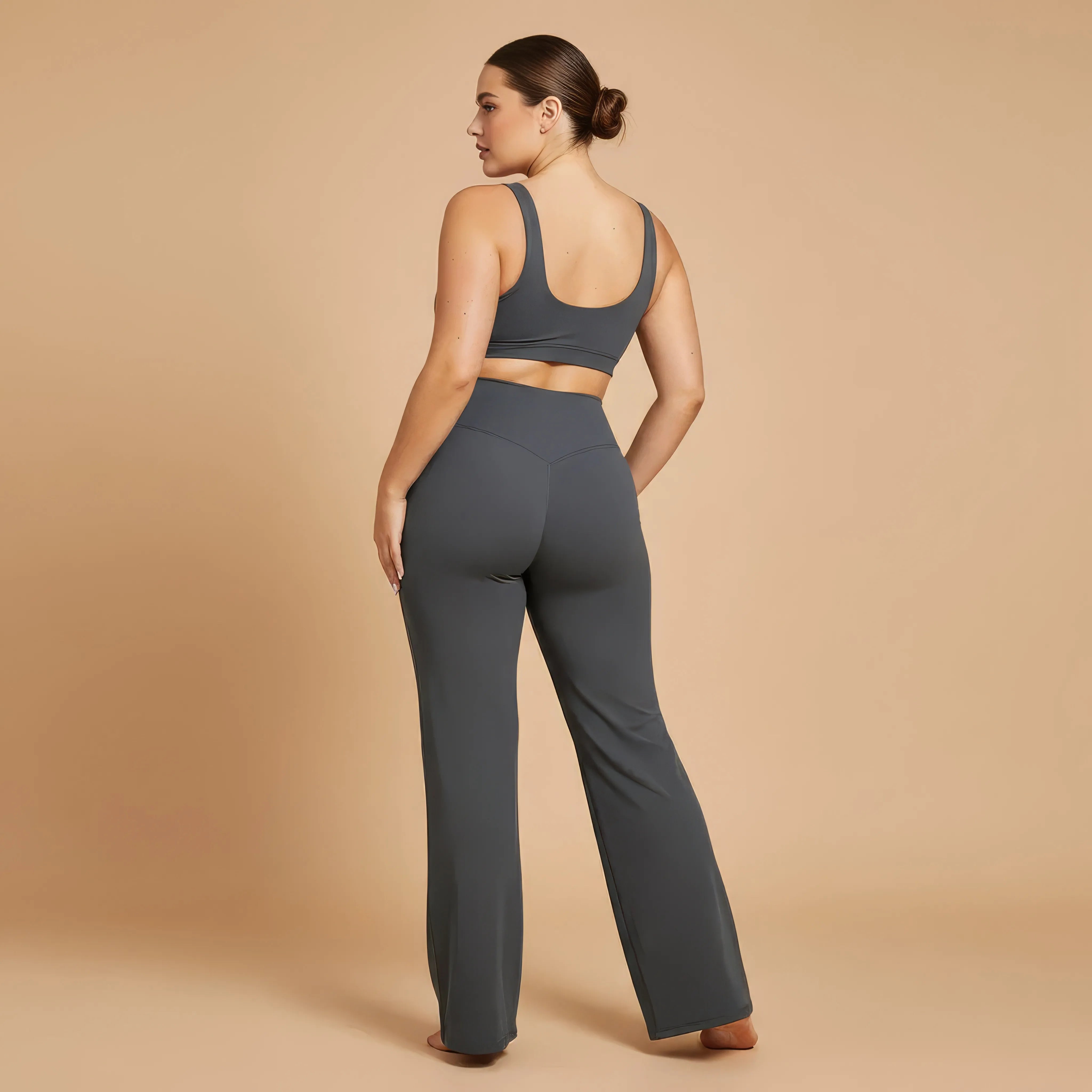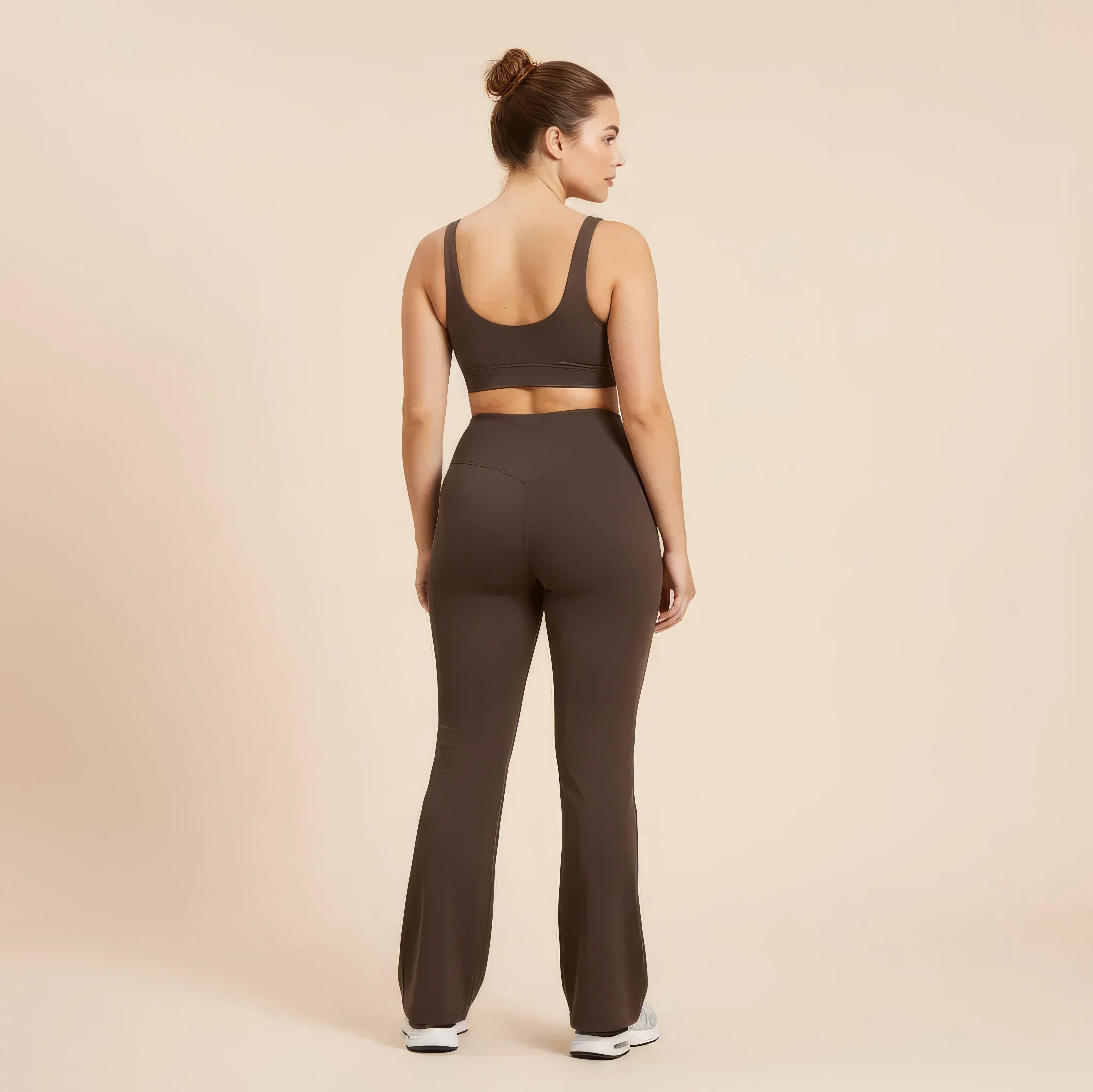 Un pantalon de yoga taille haute conçu pour allier élégance, maintien et liberté de mouvement. Sa coupe légèrement évasée allonge visuellement la silhouette tout en épousant les hanches avec naturel, pour un rendu fluide et féminin.