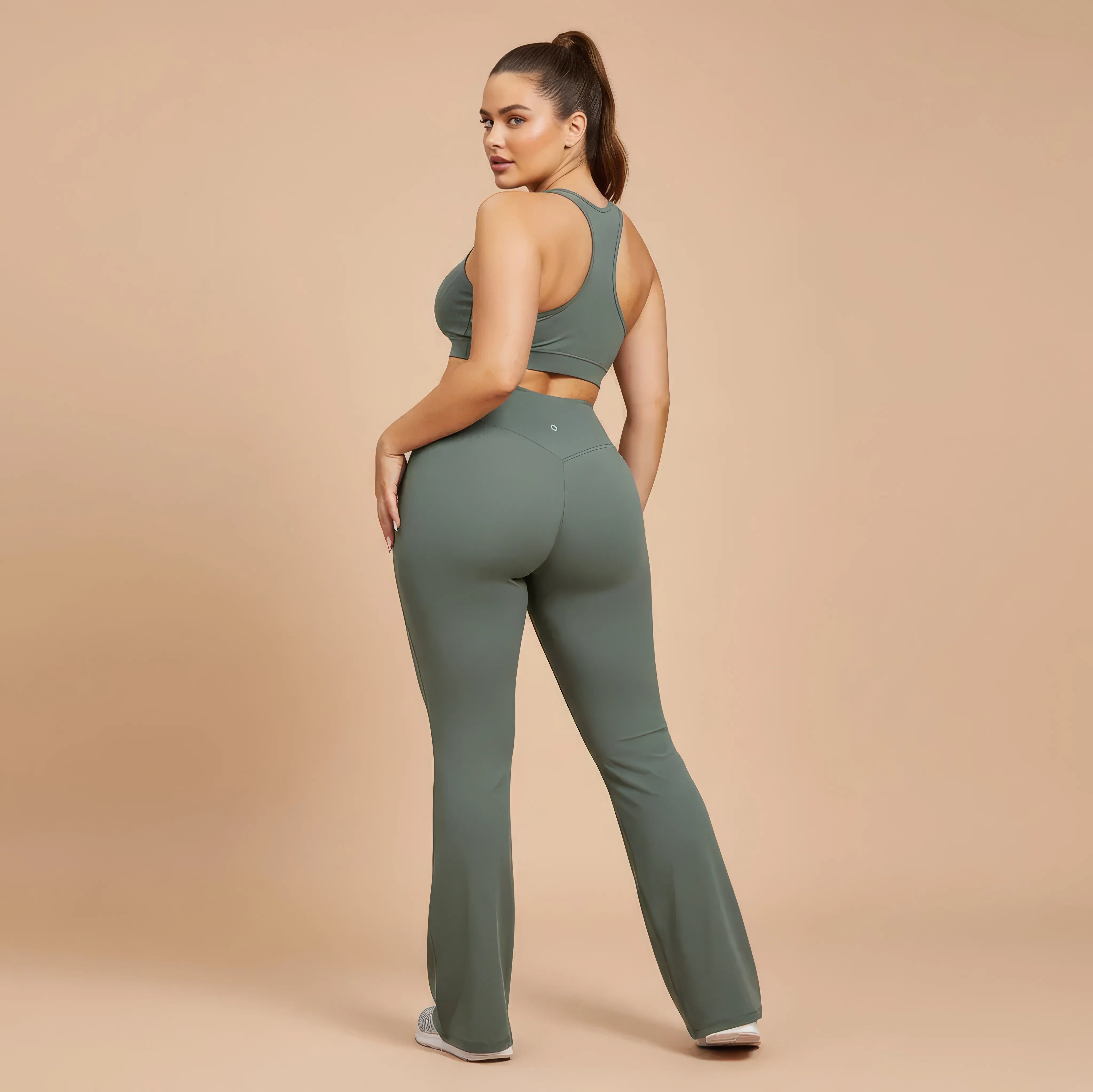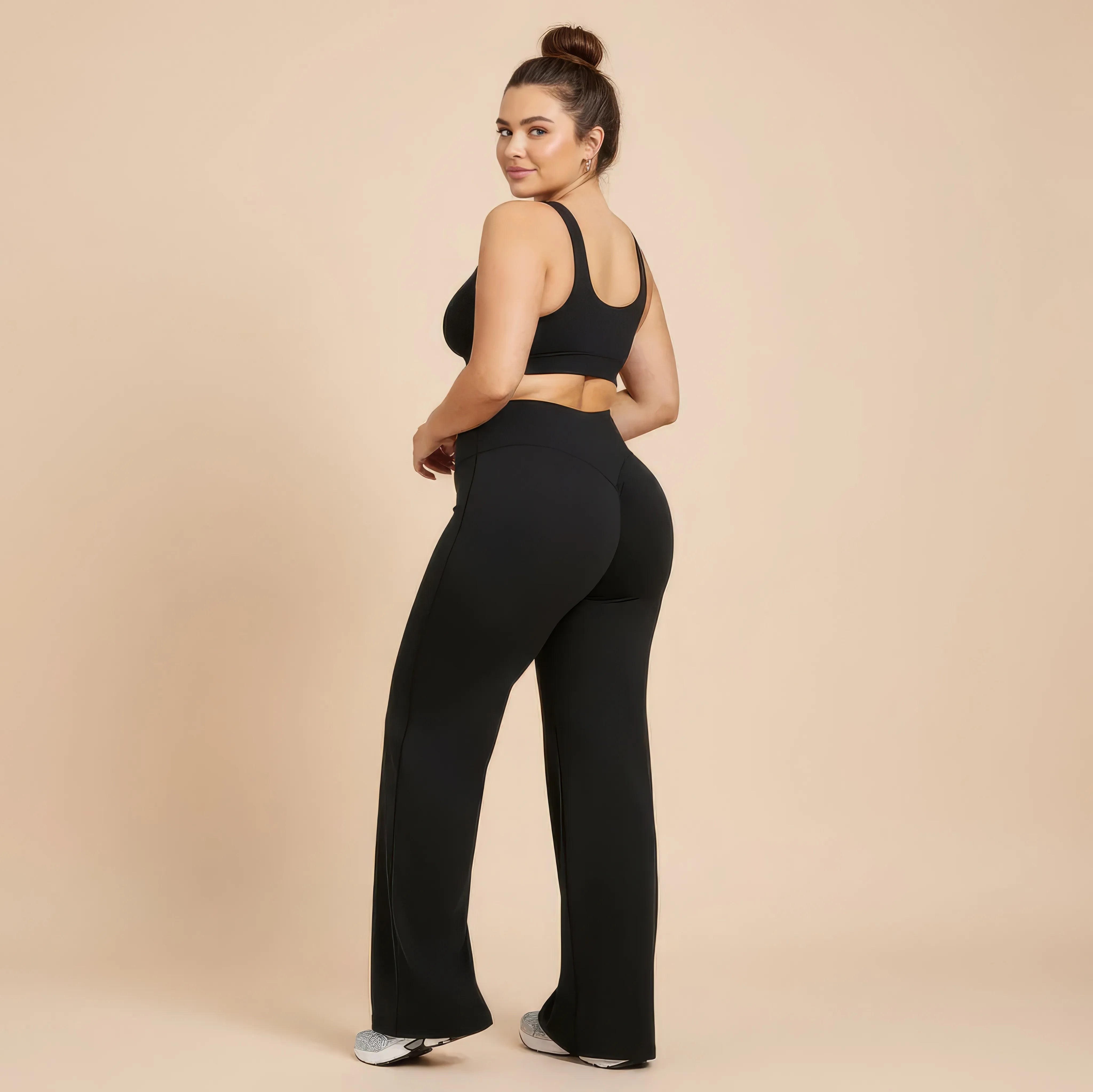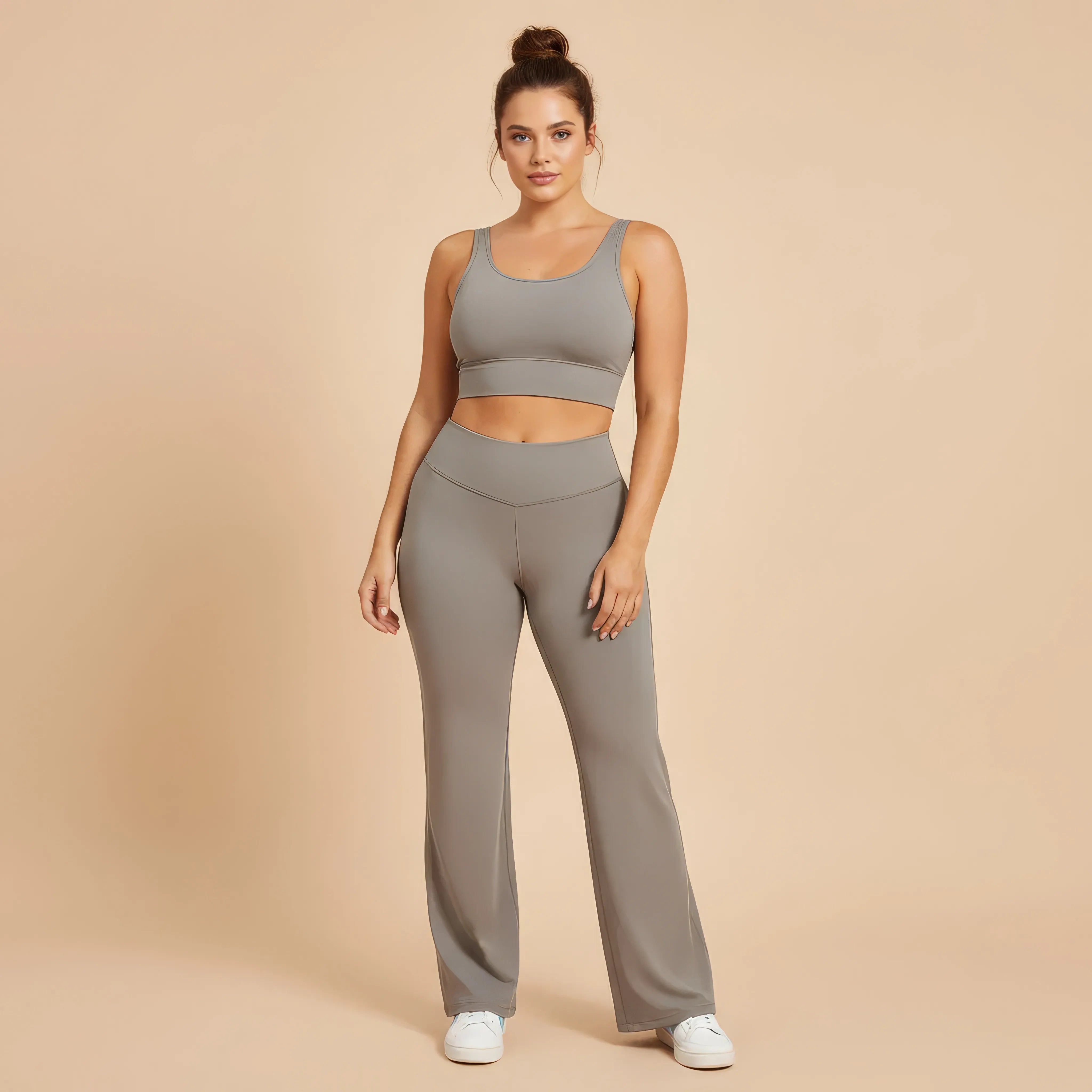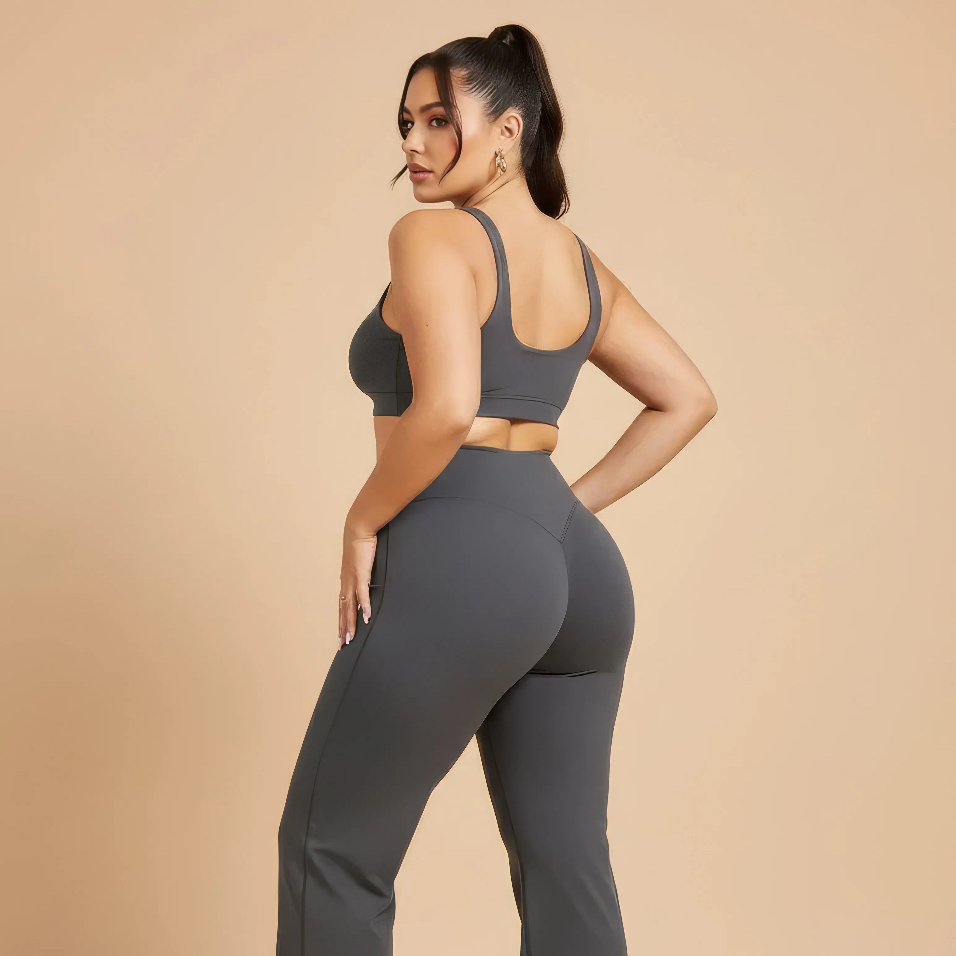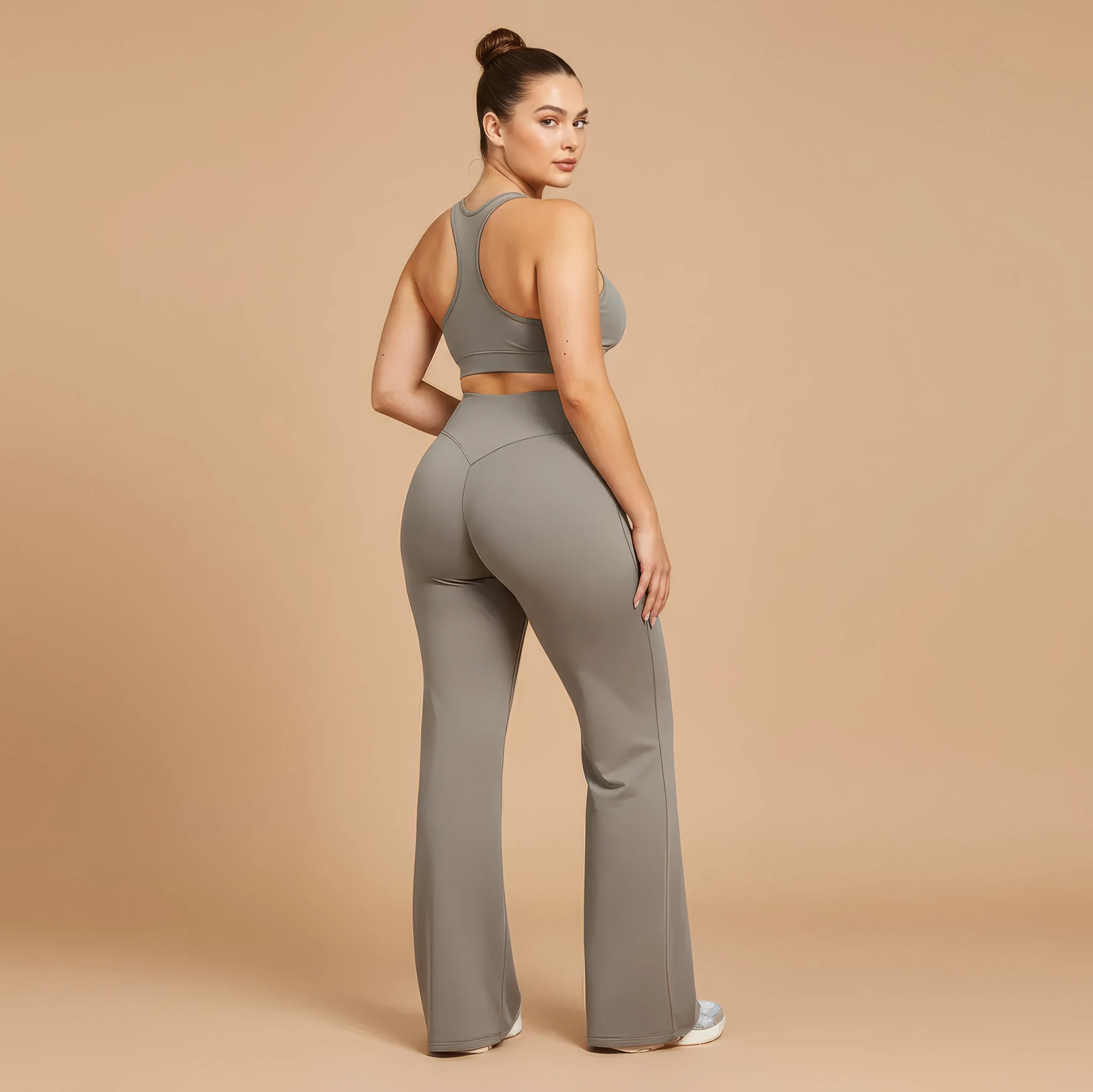 Un pantalon de yoga taille haute conçu pour allier élégance, maintien et liberté de mouvement. Sa coupe légèrement évasée allonge visuellement la silhouette tout en épousant les hanches avec naturel, pour un rendu fluide et féminin.