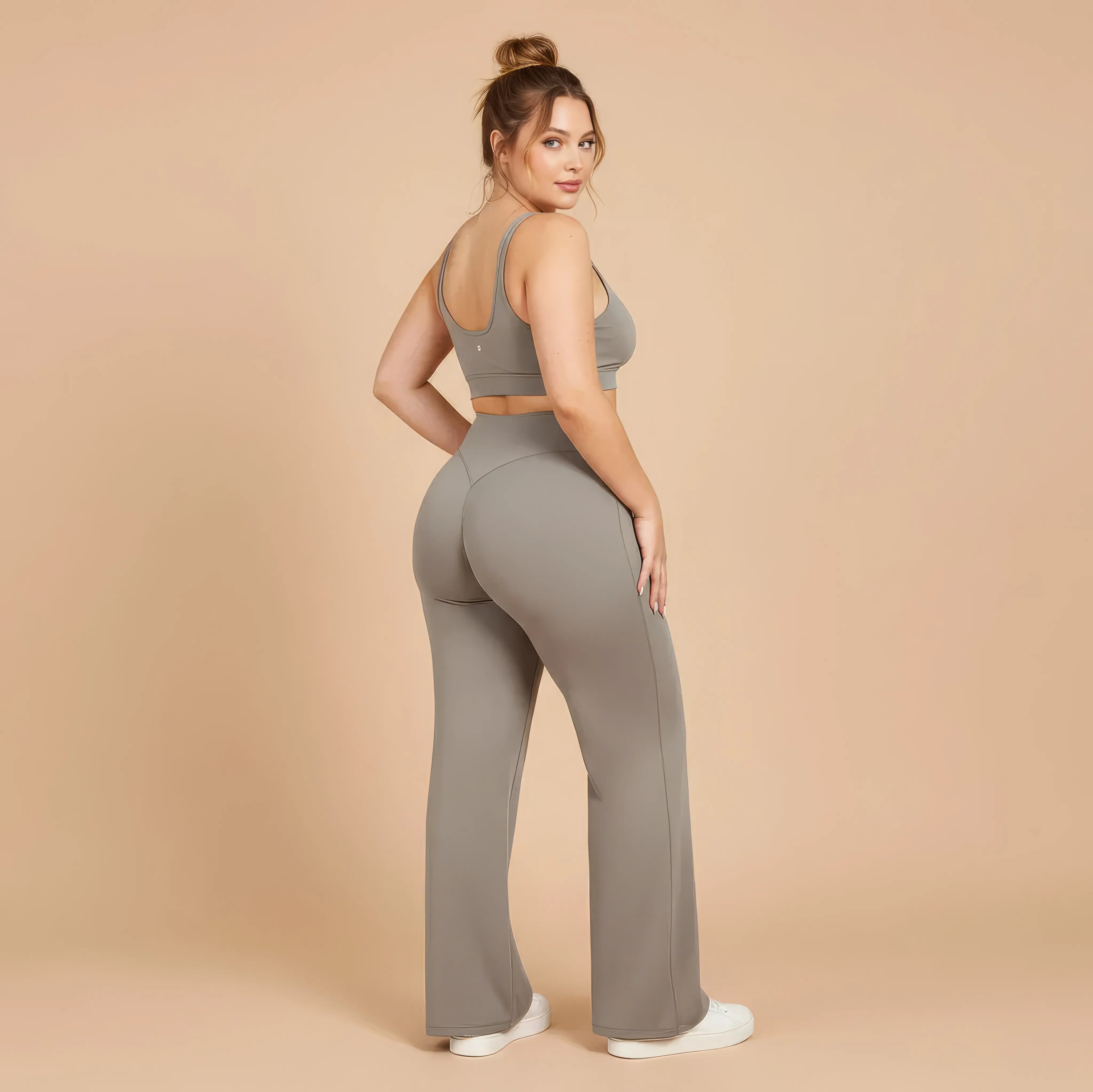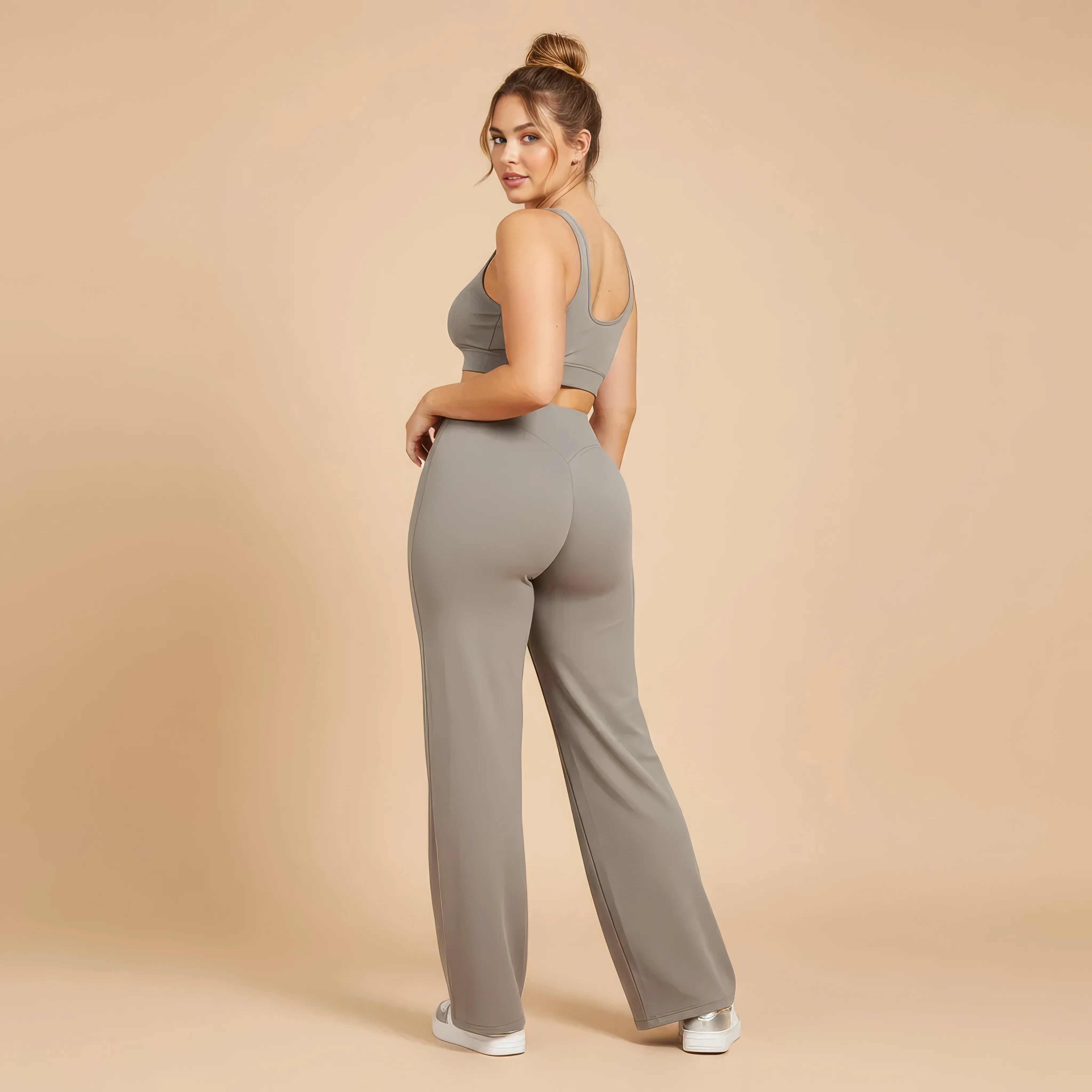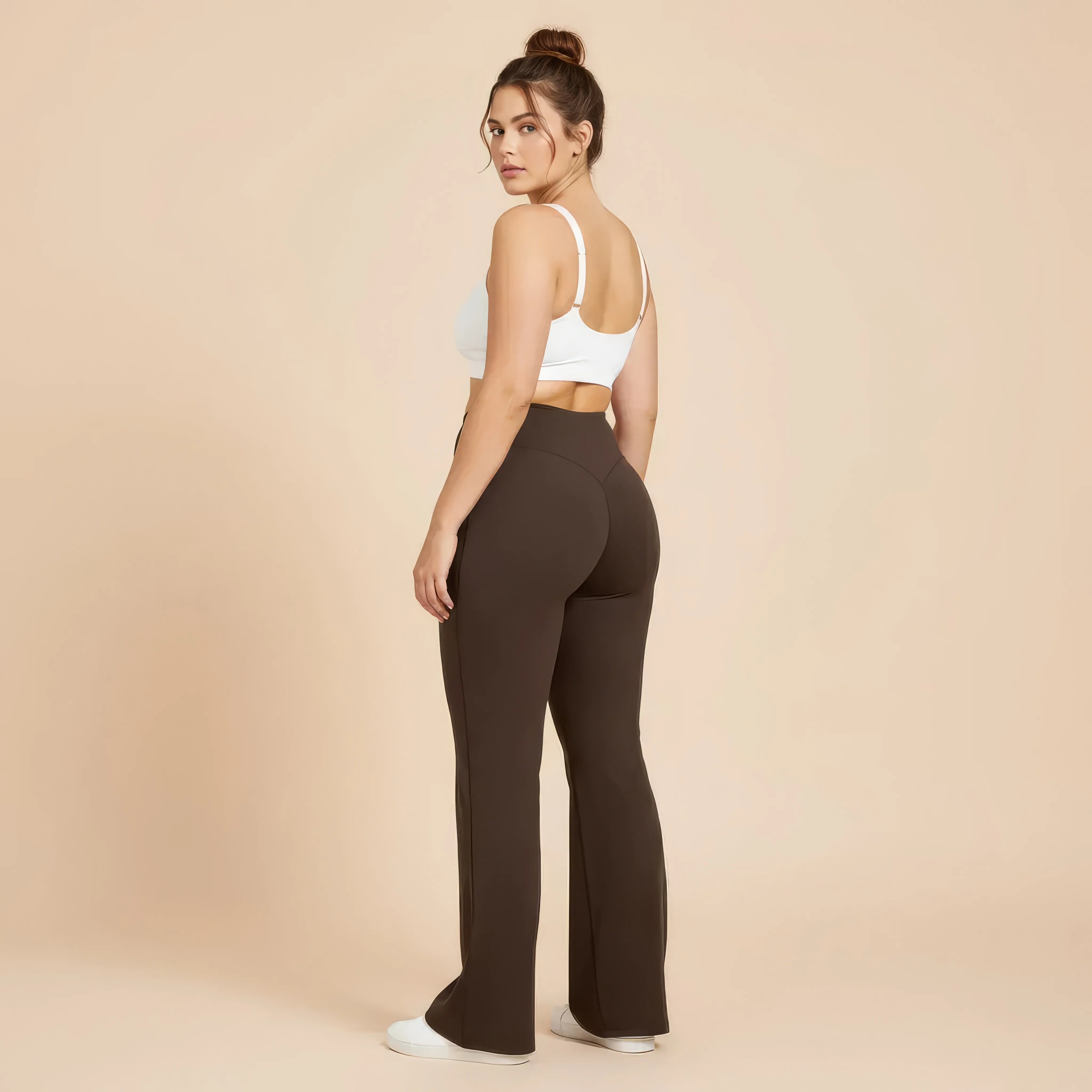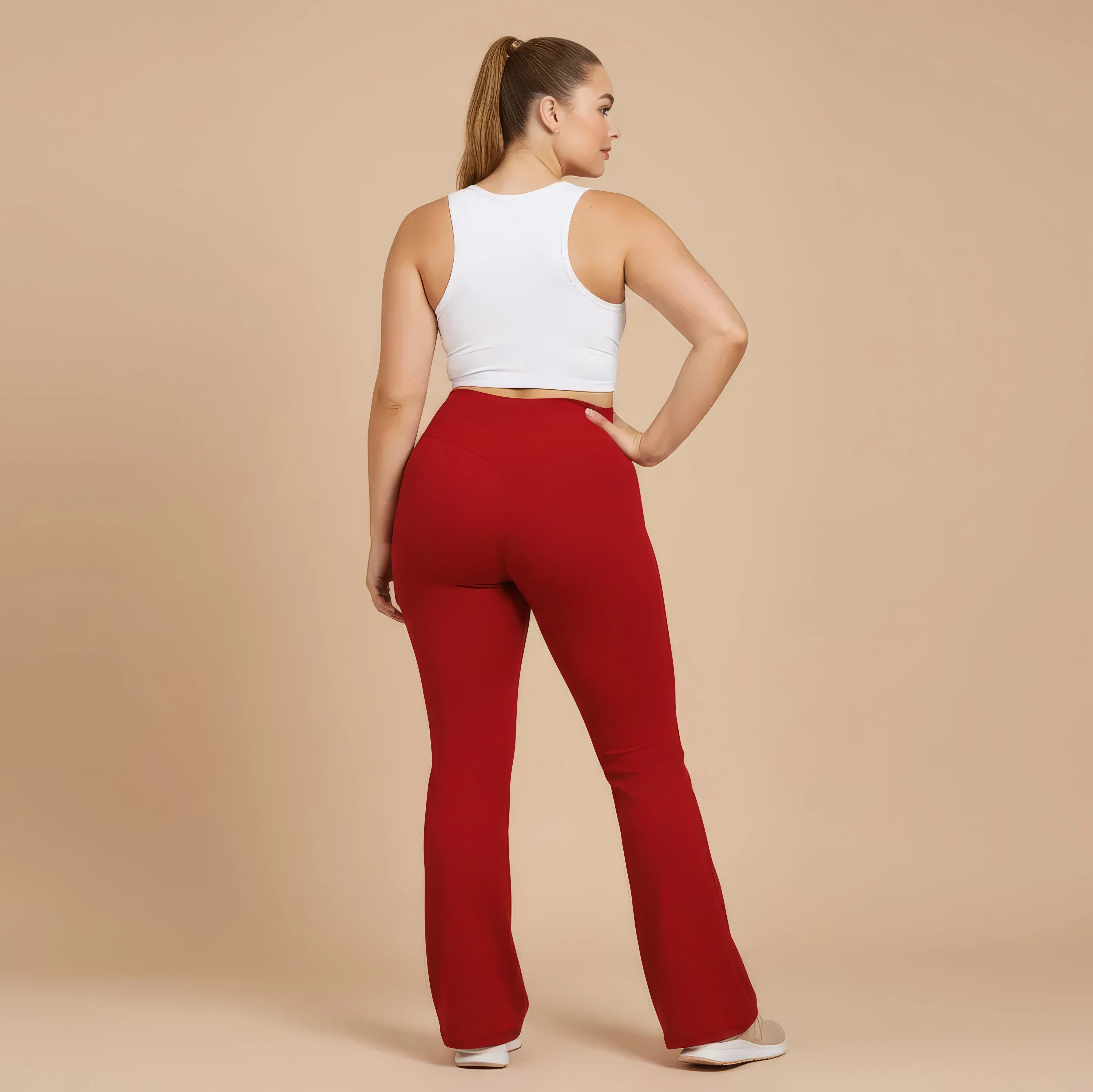 Un pantalon de yoga taille haute conçu pour allier élégance, maintien et liberté de mouvement. Sa coupe légèrement évasée allonge visuellement la silhouette tout en épousant les hanches avec naturel, pour un rendu fluide et féminin.