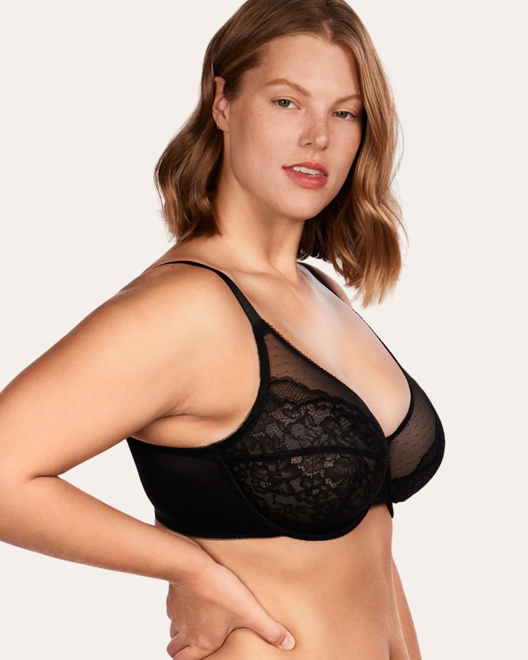 Les bonnets moulés ultra-fins assurent une tenue élégante et stable, tandis que la coupe 3/4 valorise harmonieusement le galbe naturel. Conçu pour les poitrines généreuses, il allie maintien, finesse et confort longue durée, même porté toute la journée.